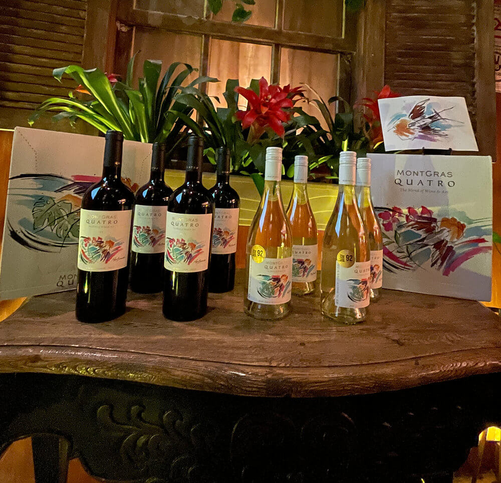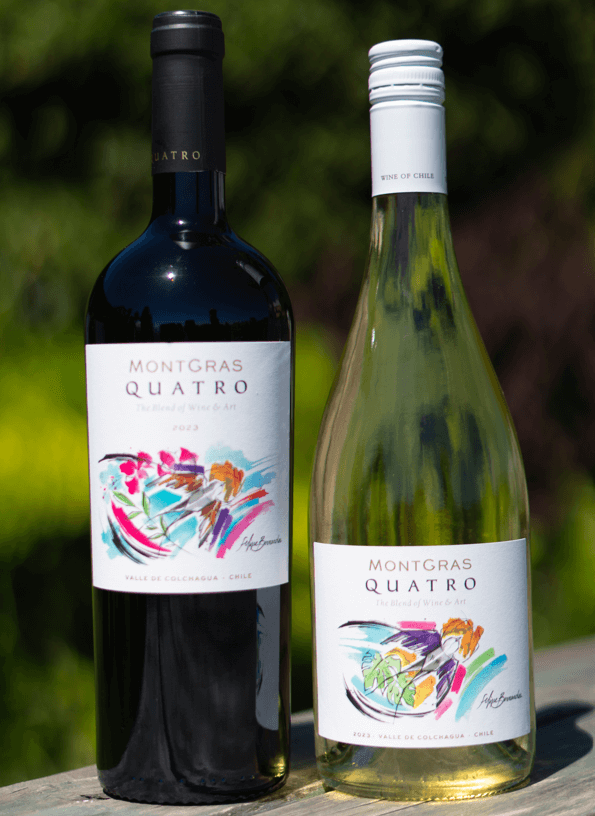 MontGras Quatro es un vino innovador que combina cuatro variedades de uvas en una sola botella, representando la creatividad y la calidad de la viticultura chilena. La edición 2023 presenta dos versiones: una tinto, compuesta por Cabernet Sauvignon, Carmenère, Syrah y Malbec, y una blanco, elaborada con Viognier, Verdejo, Vermentino y Albariño. Ambas versiones cuentan con un diseño de etiqueta exclusivo creado por Felipe Bernardes, inspirado en la naturaleza tropical de Brasil, con elementos como una golondrina y flora local, todo realizado en acuarela.